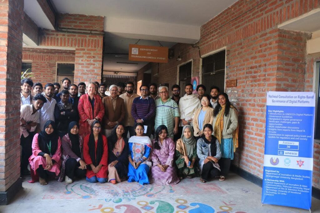 Kathmandu: A workshop on “Guidelines for the Governance of Digital Platforms: Safeguarding Freedom of Expression and Access to Information through a Multi-Stakeholder Approach” was held on January 30 at Jahangirnagar University, Bangladesh. The event was organised under a joint academic initiative involving Jahangirnagar University, the University of Vocational Technology, Sri Lanka, and Tribhuvan University, Nepal, led by the Central Department of Journalism and Mass Communication at Tribhuvan University.