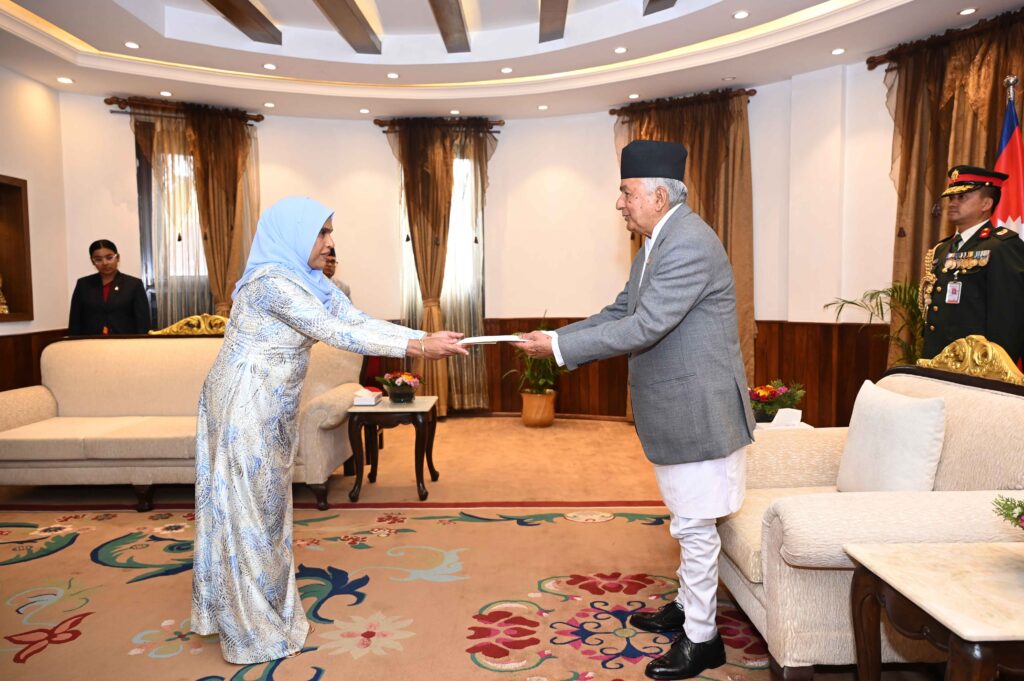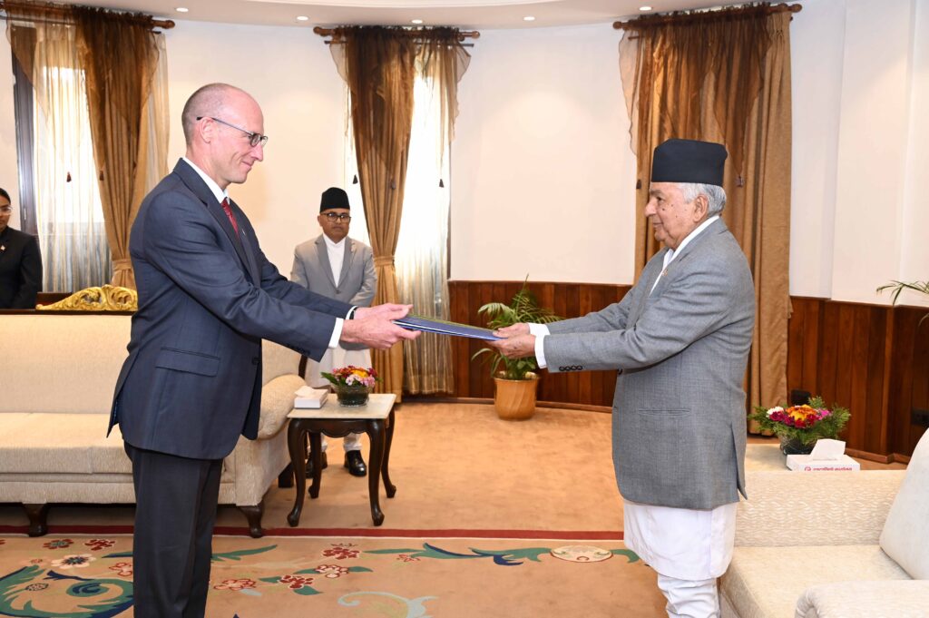 Three resident ambassadors were Australian Ambassador to Nepal Simon George Ernst, Saudi Arabia’s Ambassador Fahd Mohammad Ajmi Mnikhr, and Chinese Ambassador Zhang Maoming. Moreover, two non-resident ambassadors were Ambassador of the Maldives to Nepal, Aishath Azeema, and Ambassador of Turkey to Nepal, Ali Murat Ersoy, reads the statement of the Office of the President.