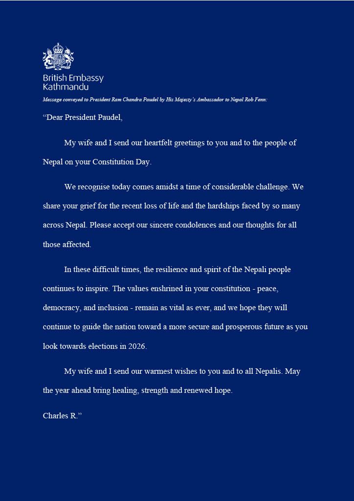 In his message, King Charles and the Queen extended heartfelt greetings to the President and the people of Nepal. The message expressed condolences for the recent loss of life and hardships faced across the country, while praising the resilience and spirit of the Nepali people in times of challenge.