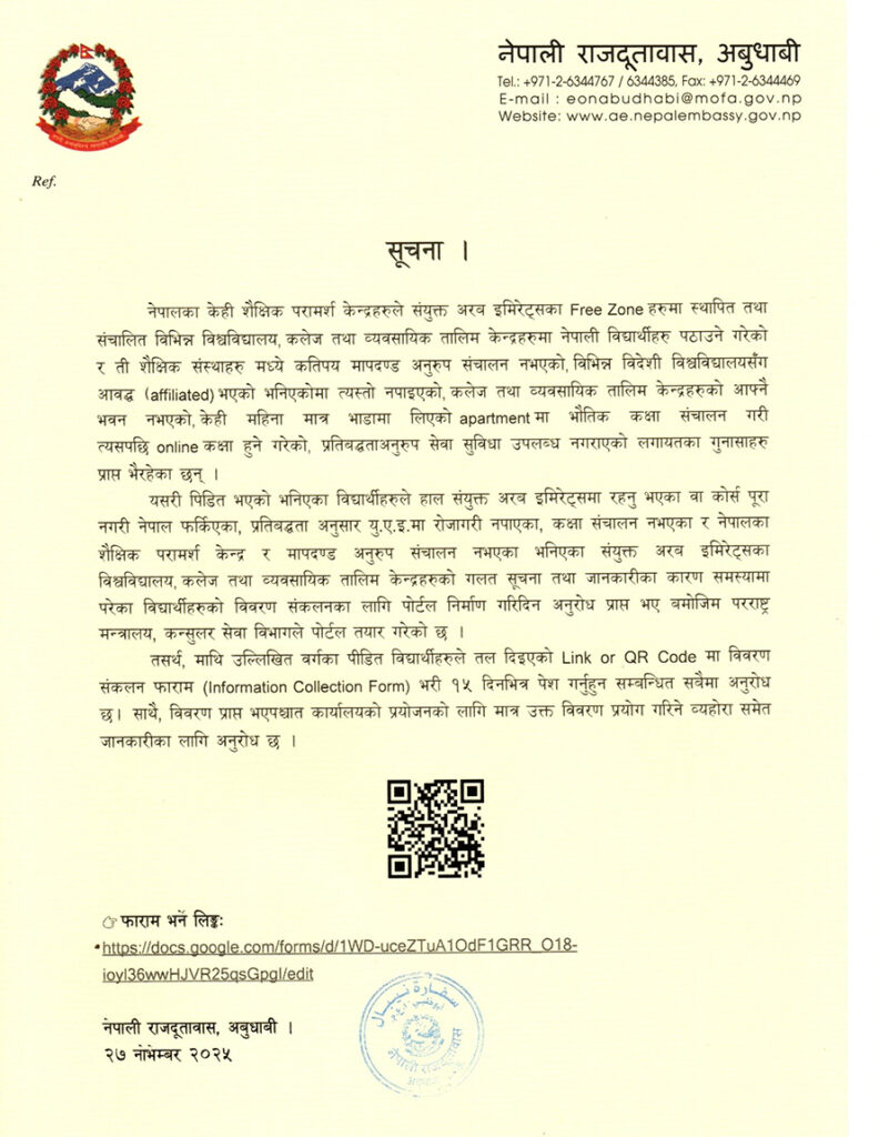 Students who experienced these issues; whether currently in the UAE or having returned to Nepal without completing their courses, or unable to find employment as promised, have been urged to submit their details. Complaints have included false claims of foreign university affiliations and misleading information from educational counseling centers in Nepal.