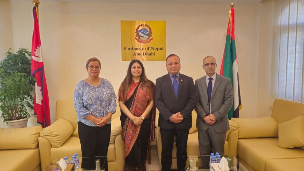 Kathmandu: President of the Ambassadors Club, Dr. Sarmila Parajuli Dhakal, visited the Nepali Embassy in Abu Dhabi on November 19. During the visit, Dr. Parajuli, a former Ambassador to Spain and Oman, met with Nepal’s Ambassador to the UAE, Tej Bahadur Chhetri, and other embassy staff.