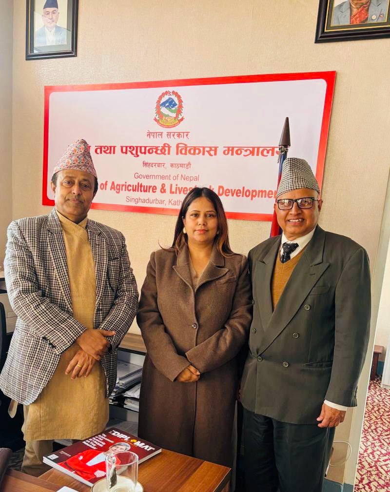 Kathmandu: Dr. Deepak Kumar Kharal, Secretary of the Ministry of Agriculture and Livestock Development, held a meeting at the Ministry with Amb. Dr. Sarmila Parajuli Dhakal, President of IRGDD, Ambassadors Club Nepal, and The Diplomat Nepal, along with Amb. Mr. Kali Prasad Pokhrel, Vice President (International Relations), IRGDD.