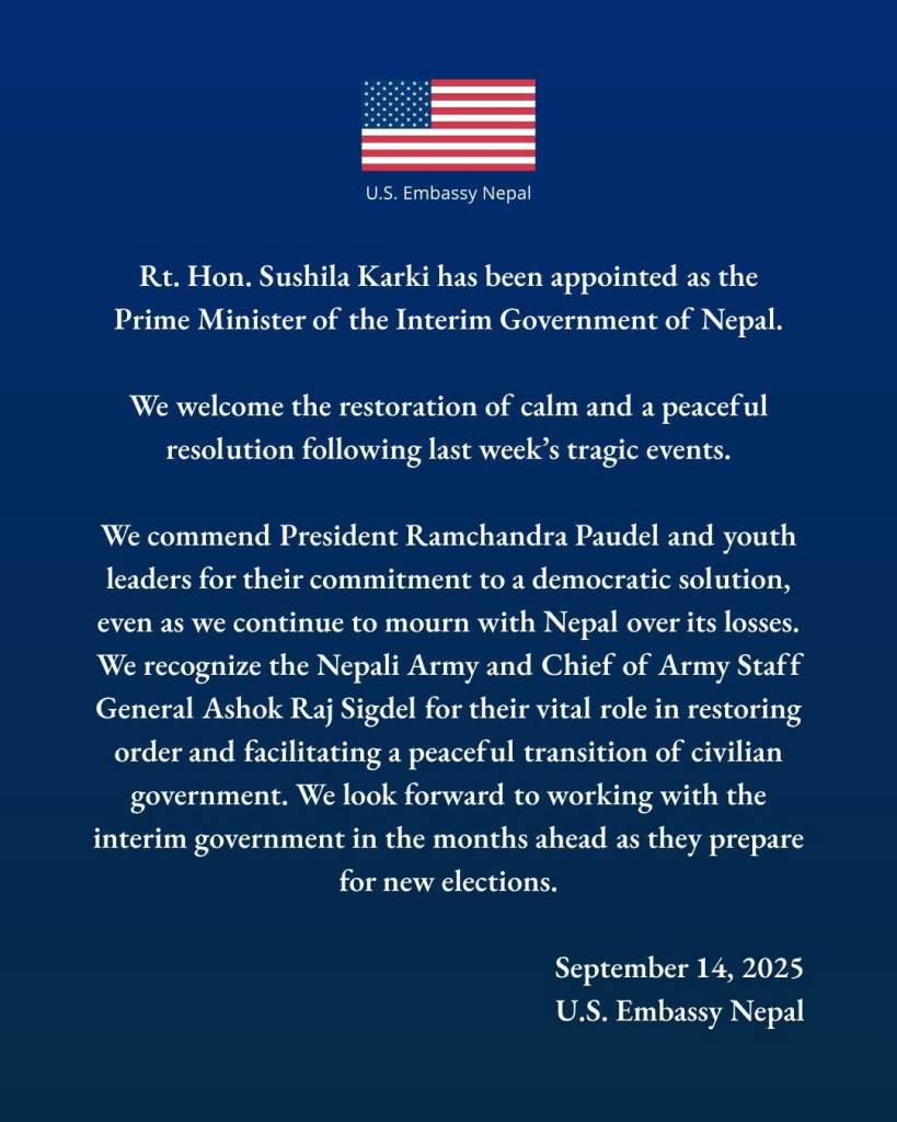 Kathmandu: The US Embassy in Nepal has welcomed the appointment of Sushila Karki as the Prime Minister of the Interim Government, noting it as a step towards stability after last week’s tragic events.